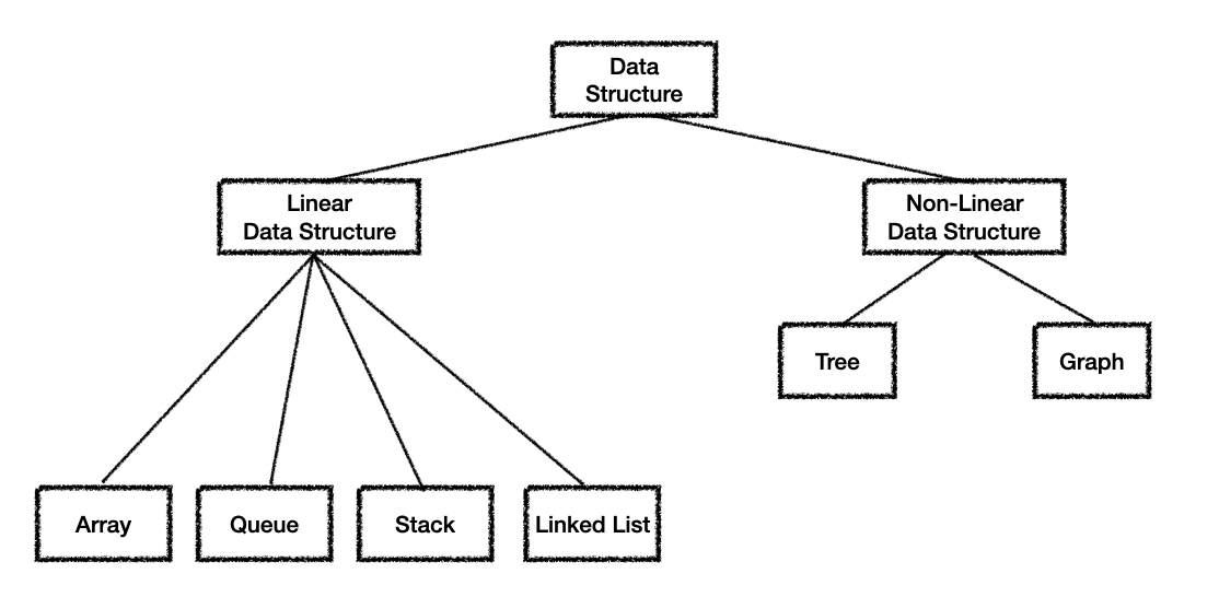 - Linear Data Structure: 데이터 요소가 순차적 또는 선형으로 구성되어 있고 이전 및 다음 인접 요소에 연결되는 데이터 구조를 선형 데이터 구조(Linear Data Structure)라고 합니다. 선형 데이터 구조의 대표적인 예로는 배열, 링크드 리스트, 큐, 스택 등이 있습니다.