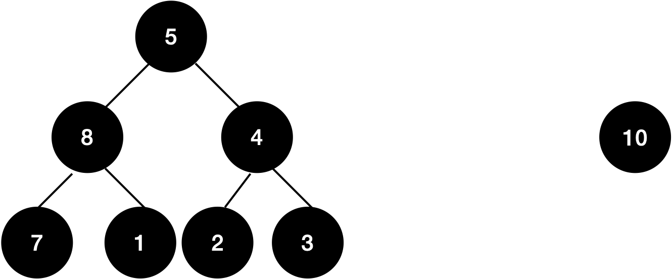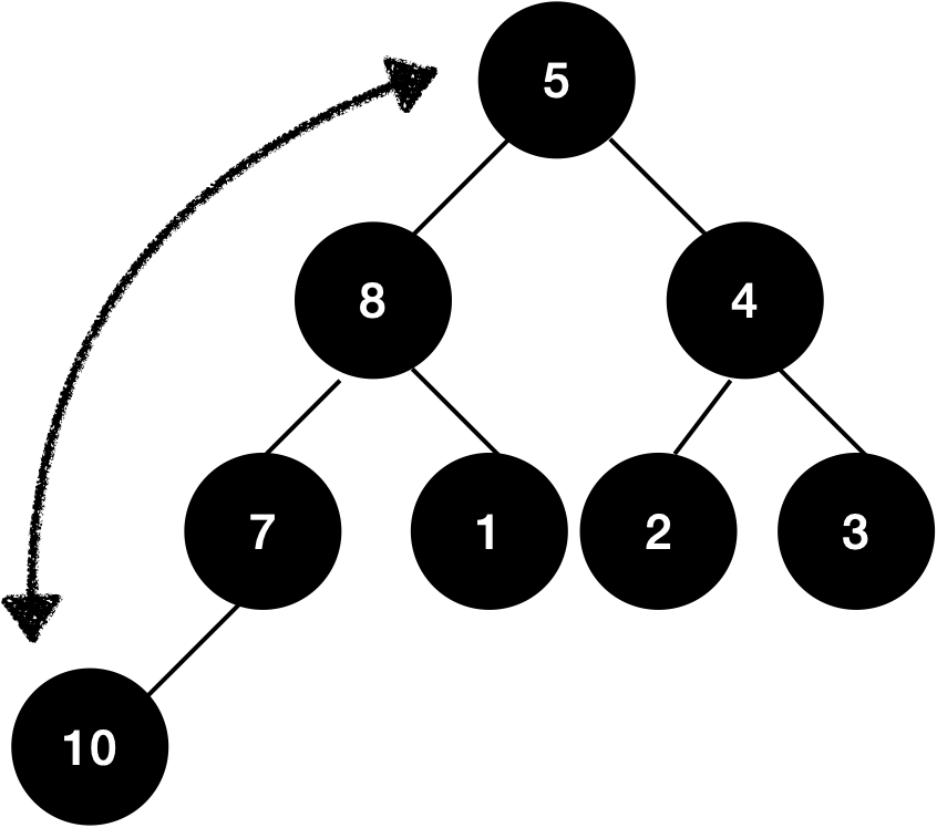 힙에서 가장 우선 순위가 높은 값(10)을 얻었네요, 그런데 여기서 멈추면 Max-heap 구조가 무너지기 때문에 재배치 하는 과정을 거칩니다.