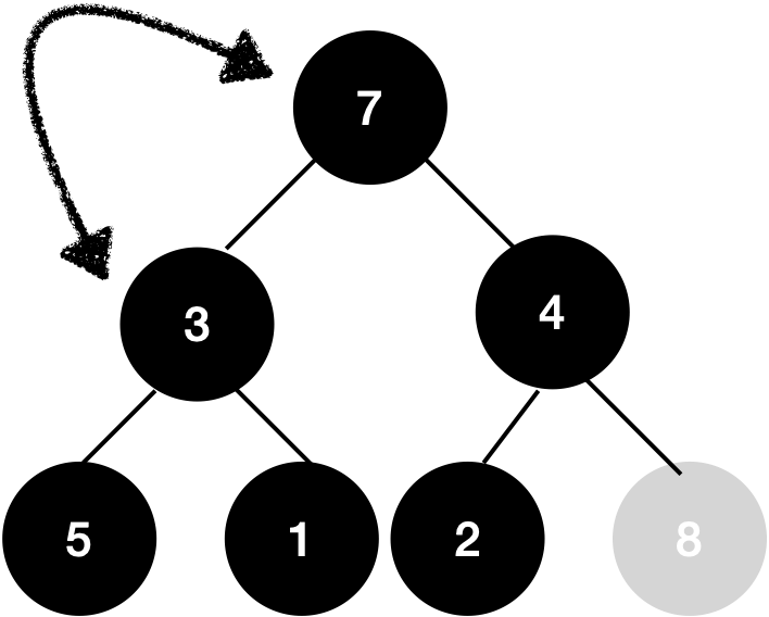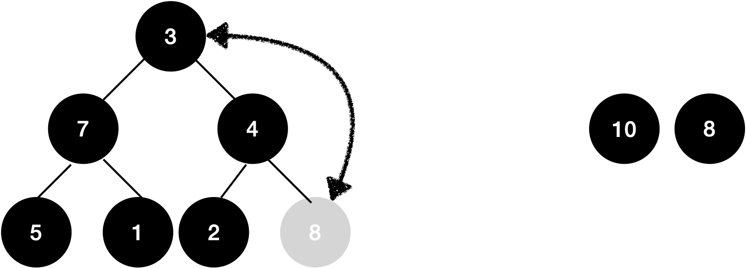 8을 빼기 위해서 가장 마지막 노드와 자리를 바꿔준 다음 8을 빼줍니다. 그런 다음 3을 sift-down 해볼게요