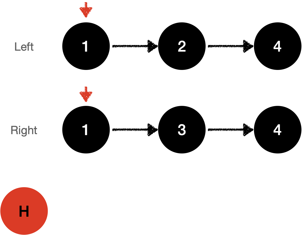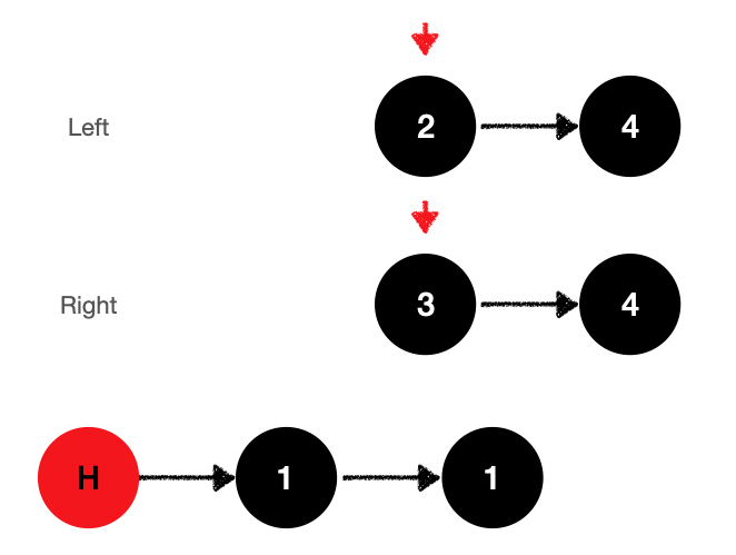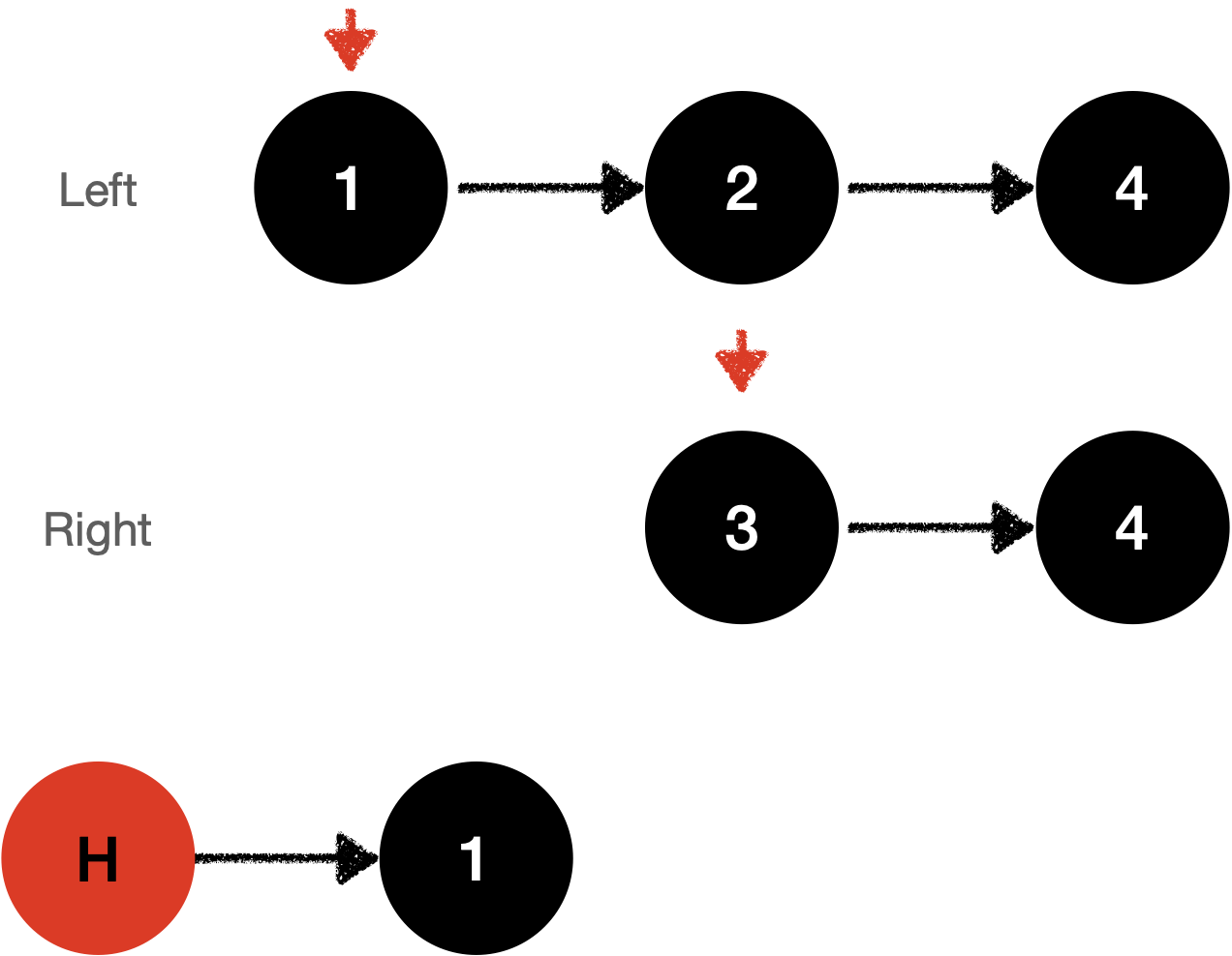Left와 Right의 CurrentNode의 Val중 누가 더 작은지 대소 비교를 해서 더 작은 노드를 Head의 next Node로 전달한다.