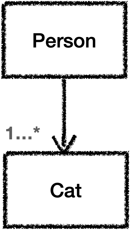 이때 Cat이 배열 즉 Person 하나가 다수의 Cat를 가지고 있다면 1...*과 같이 표현할 수 있습니다. 코드로 보자면 [Cat]과 같은 타입인 것이죠