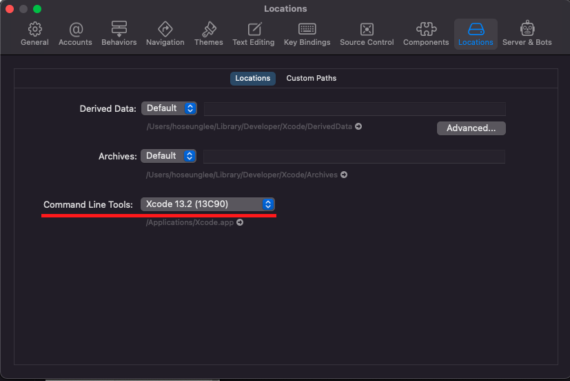 Xcode - Preferences - Locations 에 Command Line Tools 가 비어있더라, 선택해주면 해결된다.